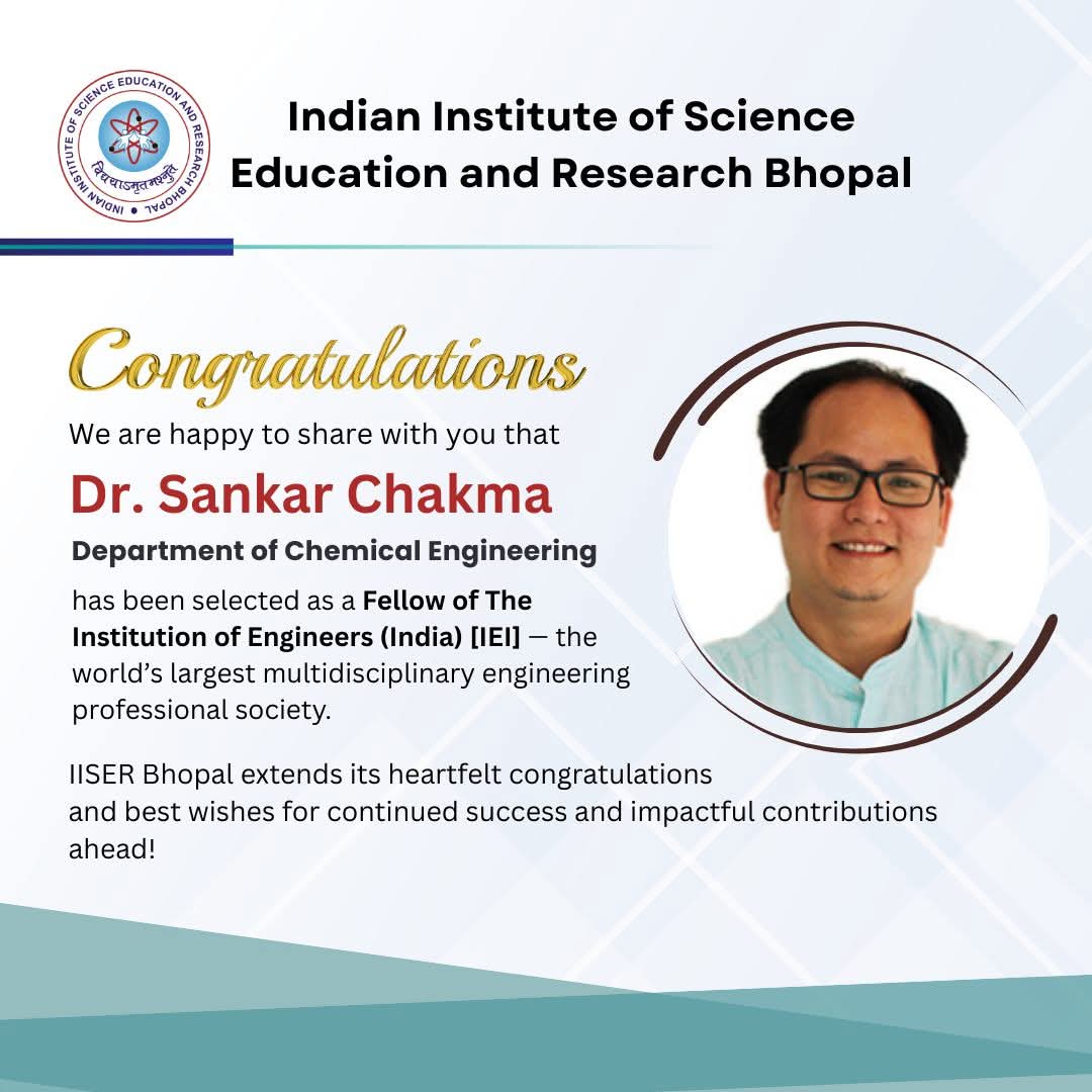 Bhopal, September 19: Dr. Sankar Chakma, faculty member in the Department of Chemical Engineering at the Indian Institute of Science Education and Research (IISER) Bhopal has been elected as a Fellow of The Institution of Engineers (India) [IEI], the world’s largest multidisciplinary professional society of engineers.